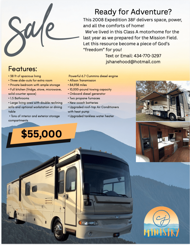 * Pray for a buyer for our RV – a beautiful Class A with a lot of life to give to an adventuring family or couple.